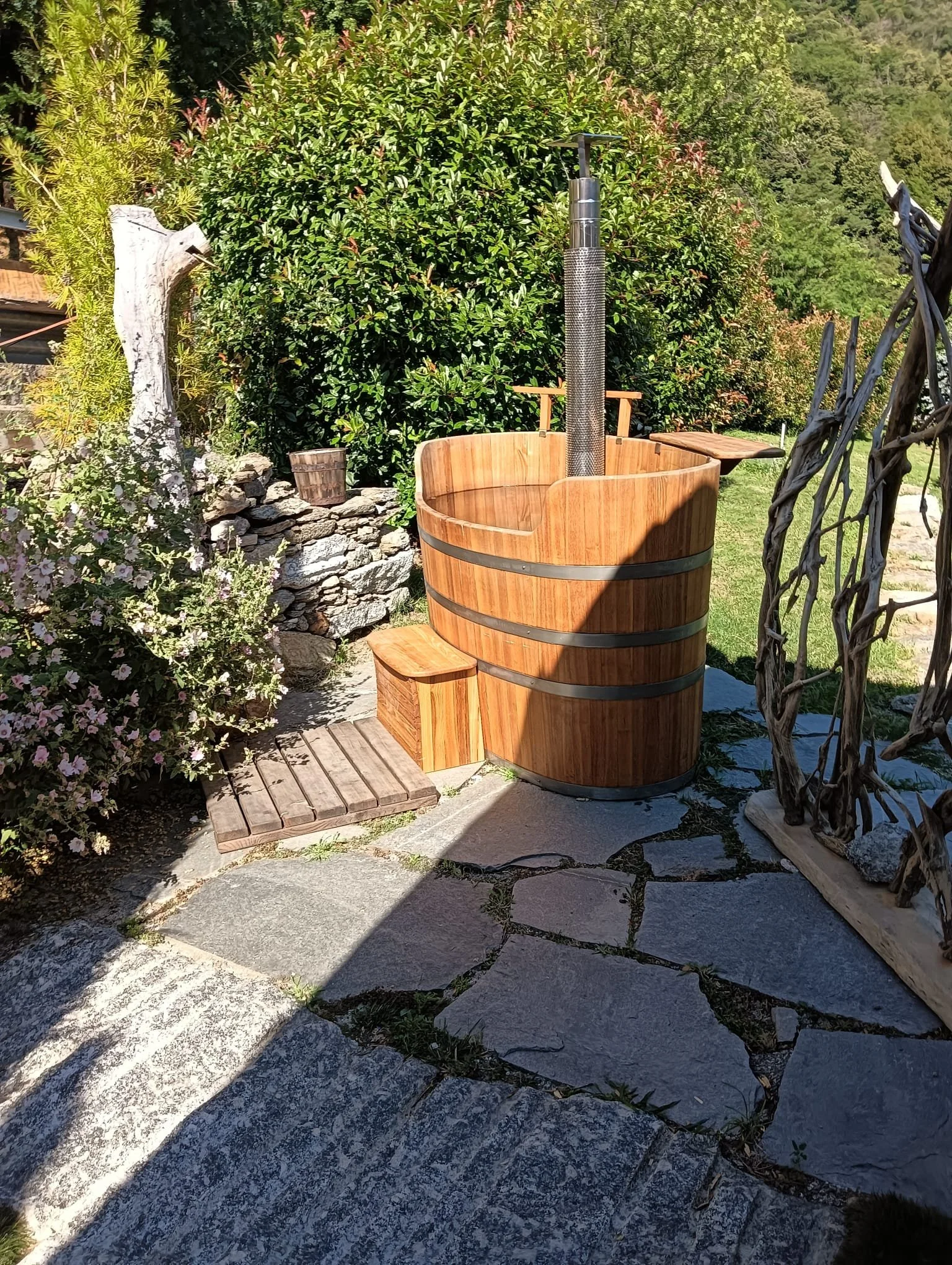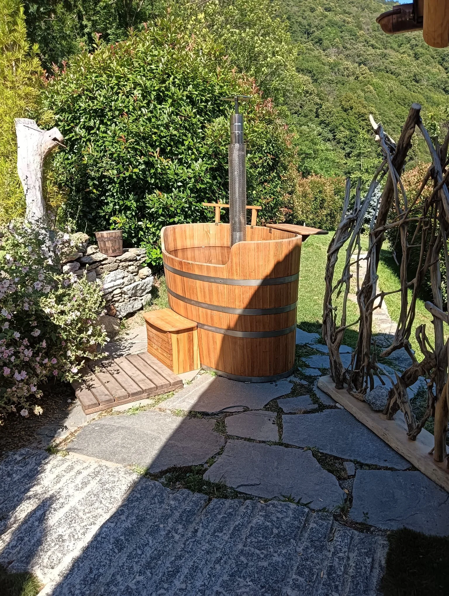 Ho acquistato una Hot Tub con stufa a legna per riscaldare l’acqua. L’ho subito posizionata in giardino: esteticamente perfetta.